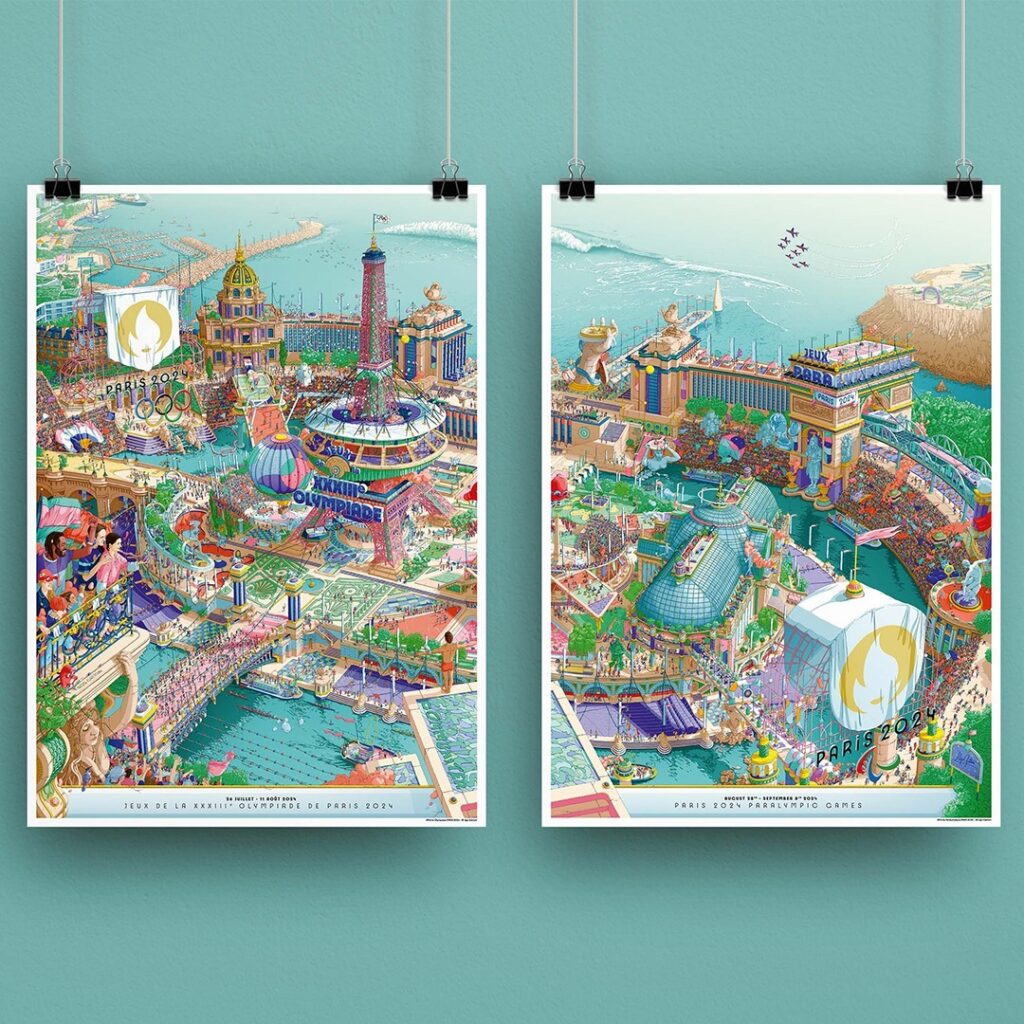 Los dos dibujos llevan a las personas a pasear a través de un “mundo de fantasía del deporte”. Monumentos históricos, incluida la Torre Eiffel y el Arco del Triunfo, son ilustrados en colores vibrantes, al igual que los escenarios Paralímpicos y Olímpicos, así como el Estadio de Francia y Les Invalides.