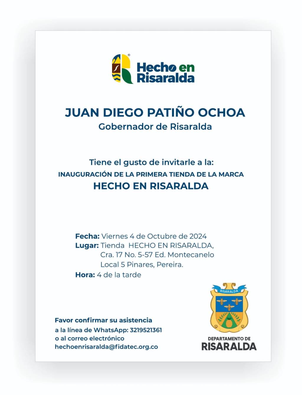 La Gobernación de Risaralda, bajo el liderazgo del gobernador Juan Diego Patiño Ochoa, dará apertura a la tienda «Hecho en Risaralda», un programa bandera que tiene como objetivo promover los productos locales y fortalecer la economía cafetera del departamento.