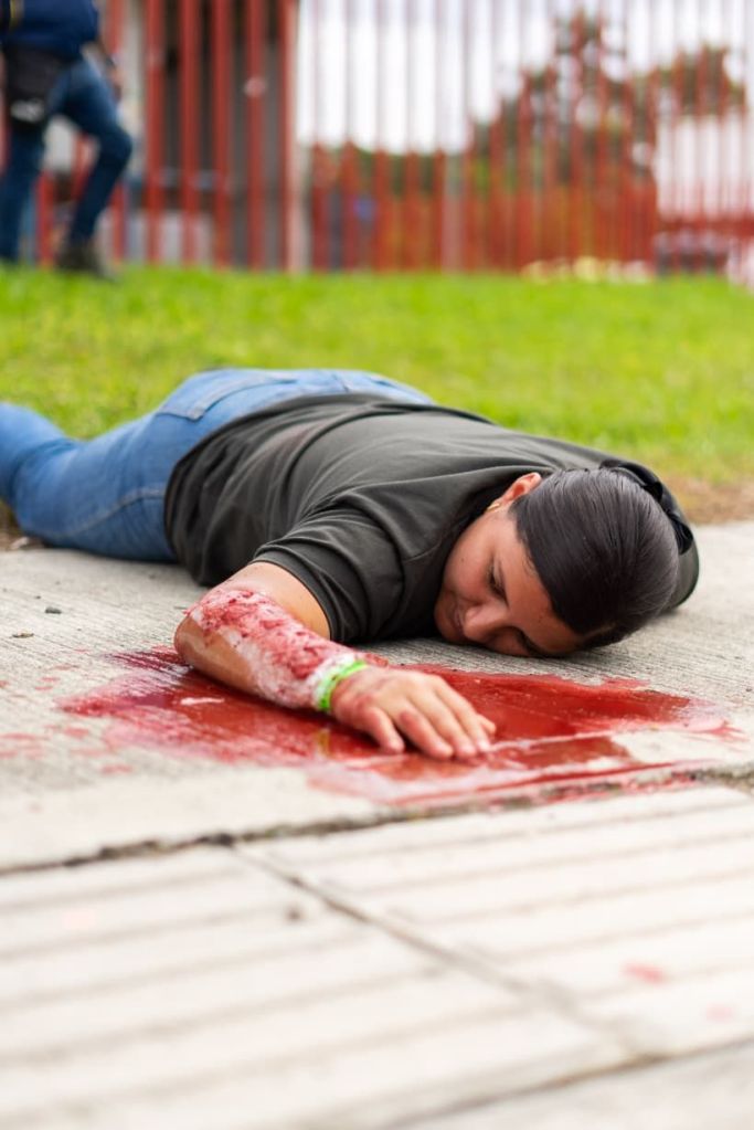 En medio del sonido de las sirenas y los gritos, dos personas atrapadas dentro del vehículo volcado fueron liberadas con la pinza de la vida, mientras el resto de víctimas —caracterizadas entre personal de la Diger y voluntarios de la Policía de Búsqueda y Rescate, gritaban simulando dolor, asfixia y enrojecimiento por exposición química.